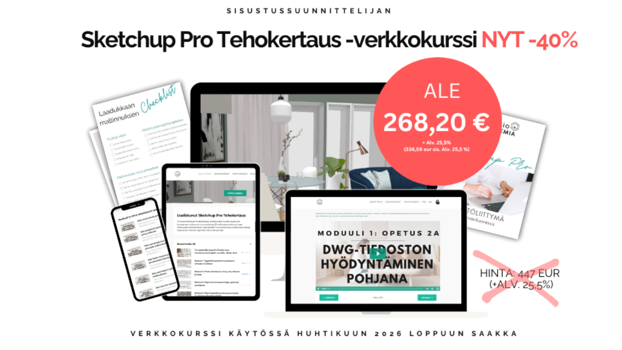 Tämä yli viisi 5 tuntia video-opetusmateriaalia sisältävä, Sketchup Pro -kertausverkkokurssi on Suomen ainut sisustussuunnittelijoille suunnattu Sketchup Pro -kertauskurssi. Jo toista sataa sisustussuunnittelijaa ovat helpottaneet Sketchup Pro Tehokertaus -verkkokurssin avulla omaa arjen mallinnustyötään tämän verkkokurssin avulla ja saaneet uuden innon Sketchupilla mallintamiseen!